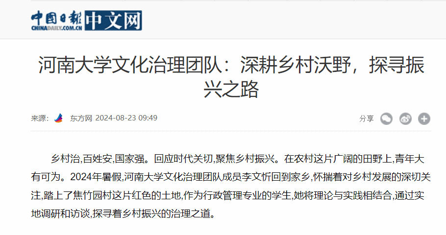 学子李文忻暑期深入河南省焦竹园村进行调研的事迹被《中国日报》报道,此次调研不仅体现了*51吃瓜
