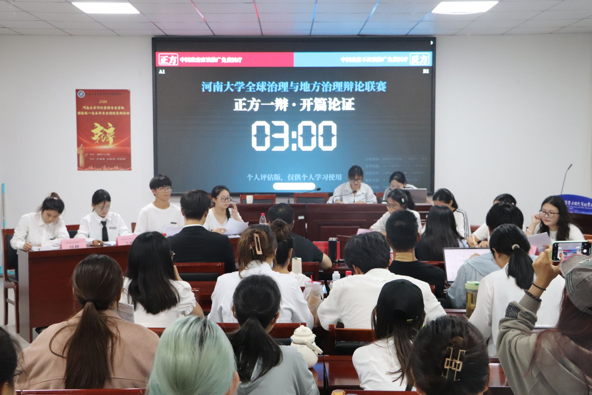 第三场辩论赛。正反双方围绕“数字治理对基层工作是增负减能还是减负增能”展开激烈辩论,深入探讨数字治理在基层工作中的实际影响。辩论赛现场,正方辩手付欣茹逻辑严谨,通过一系列数据证明数字治理在基层工作中起到了增负减能的作用。反方代表胡杨联系政策实际,结合专业知识,准确分析数字技术的广泛应用对于提升基层治理能力,达成减负增能的重要作用。