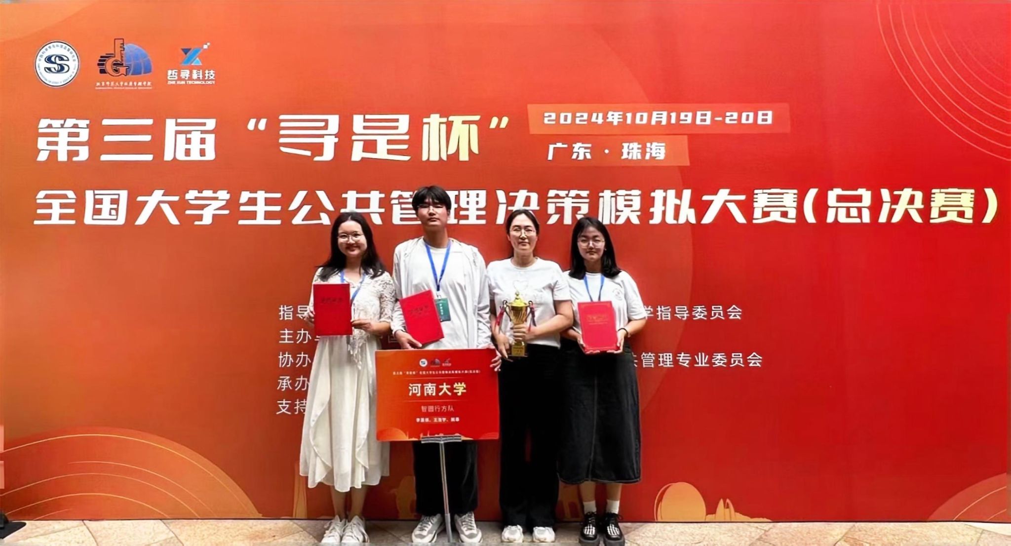 高度重视,积极组织专业教师对参赛队伍进行多轮次指导。比赛过程中,我校三名学子分工协作,条理清晰,凭借扎实过硬的专业基础和精诚高效的团队配合,在区域选拔赛和全国总决赛阶段一路过关斩将、脱颖而出,最终获得全国一等奖,展现了河大学子勇于拼搏、不断创新的精神风貌。