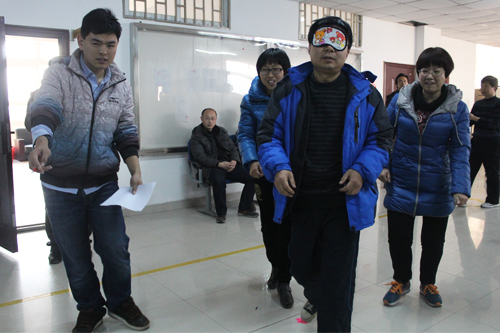 队以平稳的发挥取得该项目的胜利。你比我猜游戏要搭档用动作或语言表达出给定的词汇,提示队友说出给定词汇,在限定时间内回答正确的数量多的小组获胜。比赛各队滑稽的动作让在场教师大笑不已。在盲人击鼓环节,敲鼓的老师要站在四米远的起点,蒙住眼转五圈,向前走摸索敲三下,敲中鼓者为先胜队,老师们在活动中表现精准让在场所有人员振奋与欢呼。