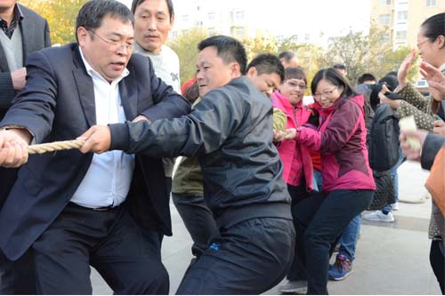 队与行政队的比赛中,两队伍实力相当,队员个个压低重心,脚跟紧贴地面,使红线反复易主,比赛现场加油声、呐喊声此起彼伏,最终行政队艰难取得本局的胜利。经决赛比拼,管理队取得了拔河的胜利。