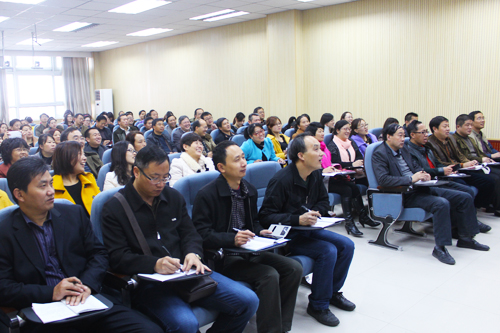 三楼会议室为国培学员授课,讲座以“中国共产党对中国特色社会主义的坚持与发展”为课题,讲述了从毛泽东到习近平——中国特色社会主义理论的发展。百余位河南省中小学教师代表参加了本次讲座。