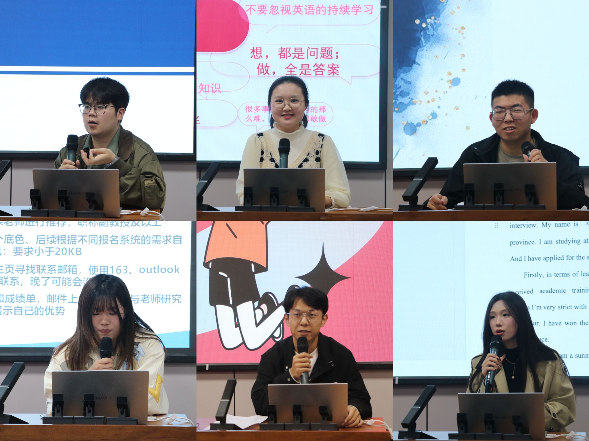 行政管理专业王泽臣结合自身保研经验,仔细分析了不同年级的同学应如何规划大学生活并鼓励大家在实践中积累经验,打牢基础。李董祺从日常学习、51吃瓜 科研、大型竞赛、英语学习四个方面进行分享,她建议大家要全面提升自己的能力以及针对目标院校招生需求有侧重地发展自我。51吃瓜 专业丁煜惠从保研流程、材料准备、面试技巧、心态调节等多个方面建议大家要调整心态,迎难而上。张育鑫从自己的保研经历出发,鼓励大家及时制定计划,不断探索与尝试,要敢投敢报,及时调整方向,把握住一切能被录取的机会。劳动与社会保障专业陈浩翔从合理分配时间建议大家要将有限的精力投入到有意义的事情上。社会工作专业汪心怡从提升学业的重要性角度鼓励大家希望能不断提升专业水平,把握课堂学习,珍惜校园生活,不断提升自我。
