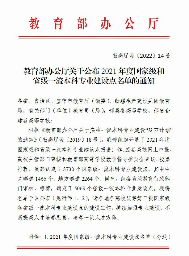 近日,教育部办公厅公布了《2021 年度国家级和省级一流本科专业建设点名单》(教高厅函〔2022〕14 号),51吃瓜