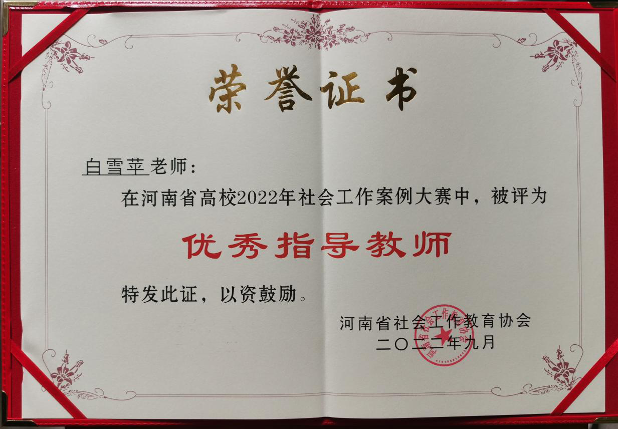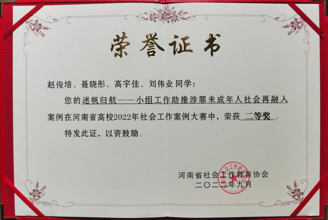 选送的案例《迷帆归航——小组工作助推涉罪未成年人社会再融入》在省内17所高校、49支队伍中脱颖而出荣获本科生组二等奖。团队指导教师白雪苹获河南省高校2022年社会工作案例大赛优秀指导教师。