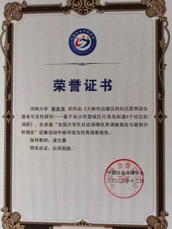 2020级社会保障专业研究生曾泉海的题为《大都市边缘区的社区医养结合服务可及性研究—基于长沙市望城区月亮岛街道5个社区的调研》作品,在劳动与社会保障系凌文豪教授指导下,通过层层选拔,在此次征集活动中被评选为社会保障优秀调查报告!