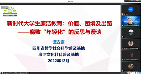 院长谭安富教授为我们带来主题为“新时代大学生廉洁教育的价值、困境及进路”的讲座,以介绍大学生廉洁教育的价值意蕴为开端,引出当今时代大学生廉洁教育面临的现实困境,提出廉洁教育之发展之路与相关措施,使得大学生深刻认识到自身也能为廉洁建设参与贡献。