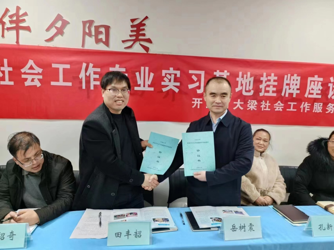 副院长田丰韶及双方相关部门负责人和社工系部分学生代表参加签约仪式。仪式由大梁社工岳树震主任主持。