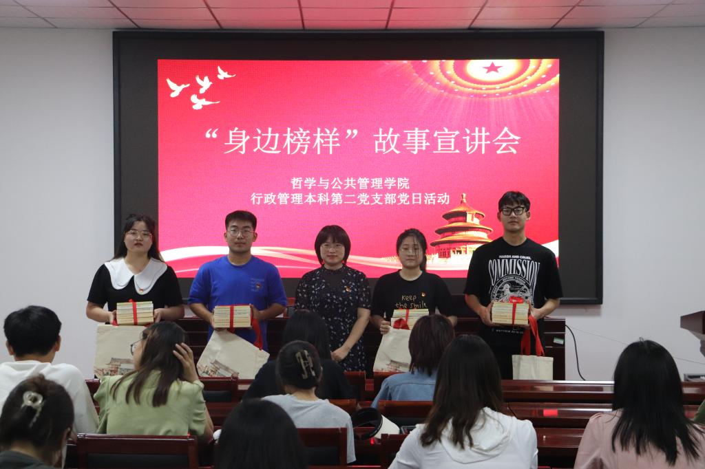 行政管理本科第二党支部书记贾银兰表示:榜样不是触摸不到的“天花板”,他们是一个个有情有义、可感可触的、可追可及的身边人、普通人。讲好一个故事胜过说一大通道理。身边榜样是有形 的正能量、生动的教科书,号召大家用实际行动践行榜样精神、传承榜样力量。