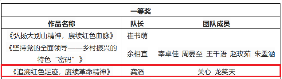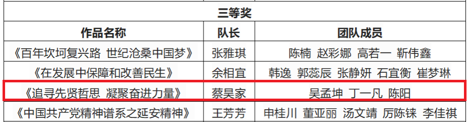 荣获优秀组织奖,院党委副书记何威和党委办公室负责人王天宇获评优秀指导教师,学生龚滔团队参赛作品《追溯红色足迹,赓续革命精神》荣获一等奖,蔡昊家团队参赛作品《一砖一瓦皆荣光,奋楫杨帆起新航》和朱佳凝团队参赛作品《追寻先贤哲思,凝聚奋进力量》荣获三等奖。