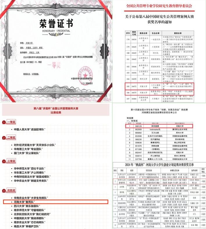 不断强化和优化社会实践教学,以大赛为抓手,推进“以赛促教、以赛促学、以赛提能、以赛促用”,劳动与社会保障系李晓玉教授、行政管理系元帅博士指导的由行政管理专业李董祺、王浩宇,劳动与社会保障专业解菲三名同学组成的参赛团队,在第三届“寻是杯”全国大学生公共管理决策模拟大赛(华中赛区)中斩获一等奖;行政管理系刘辉教授指导的“政青春-师出同门”团队的作品和社会工作系朱磊副教授指导的“三只小熊突然碰队”团队的作品在来自全国260所院校的2597支队伍中脱颖而出,荣获优秀奖;行政管理系李有学副教授、吴岚波副教授担任指导老师,行政管理专业韦梦梦、朱佳凝、龚滔、张向前,社会工作专业李菁如五位同学撰写的案例分析报告获得全国优胜奖,创造了我校学子在该赛事的最好成绩;由李晓玉教授指导,2022级行政管理专业陈宛玥等同学组成的阿闯面塑团队在第十四届全国大学生电子商务“创新、创意及创业”挑战赛中荣获河南赛区省级选拔赛特等奖;李晓玉教授指导的团队参赛项目《手艺·拾遗——让面塑搭上文创“快车”,做非遗传承的引潮者》荣获2024年“挑战杯”51吃瓜-吃瓜网