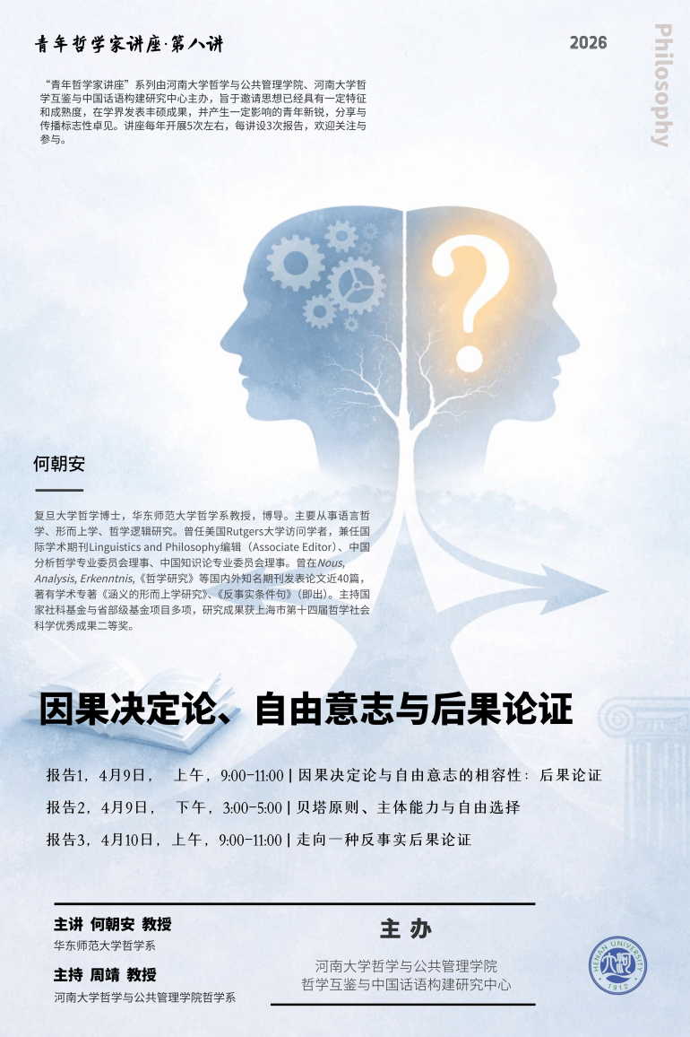 本次系列讲座探讨当代因果决定论世界观下的自由意志问题,一共三讲。第一讲“因果决定论与自由意志的相容性——后果论证”,主要介绍范·因瓦根的后果论证及其对相容性的挑战。第二讲“贝塔原则、主体能力与自由选择”深入辨析后果论证所依赖的贝塔原则及各种改进方案。第三讲“走向一种反事实后果论证”借助反事实条件句语义学阐述一种新的后果论证方案。